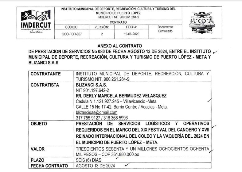 Así lo pudo evidenciar este medio de comunicación al revisar los contratos de logística y contratación de artistas, ambos firmados por el Instituto municipal de deporte, recreación, cultura y turismo del municipio de Puerto López (Imdercut).
